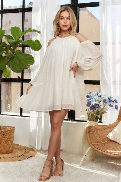 A Cold Shoulder Balloon Sleeve Mini Dress is a chic and trendy choice for various occasions. The cold shoulder design adds a flirty and modern touch to the dress, exposing the shoulders in a stylish way. The balloon sleeves create a dramatic and voluminous silhouette, adding a fashionable statement to the outfit. The mini length offers a youthful and playful vibe, perfect for parties, nights out, or special events. Pair this dress with heels and statement accessories for a bold and eye-catching ensemble.