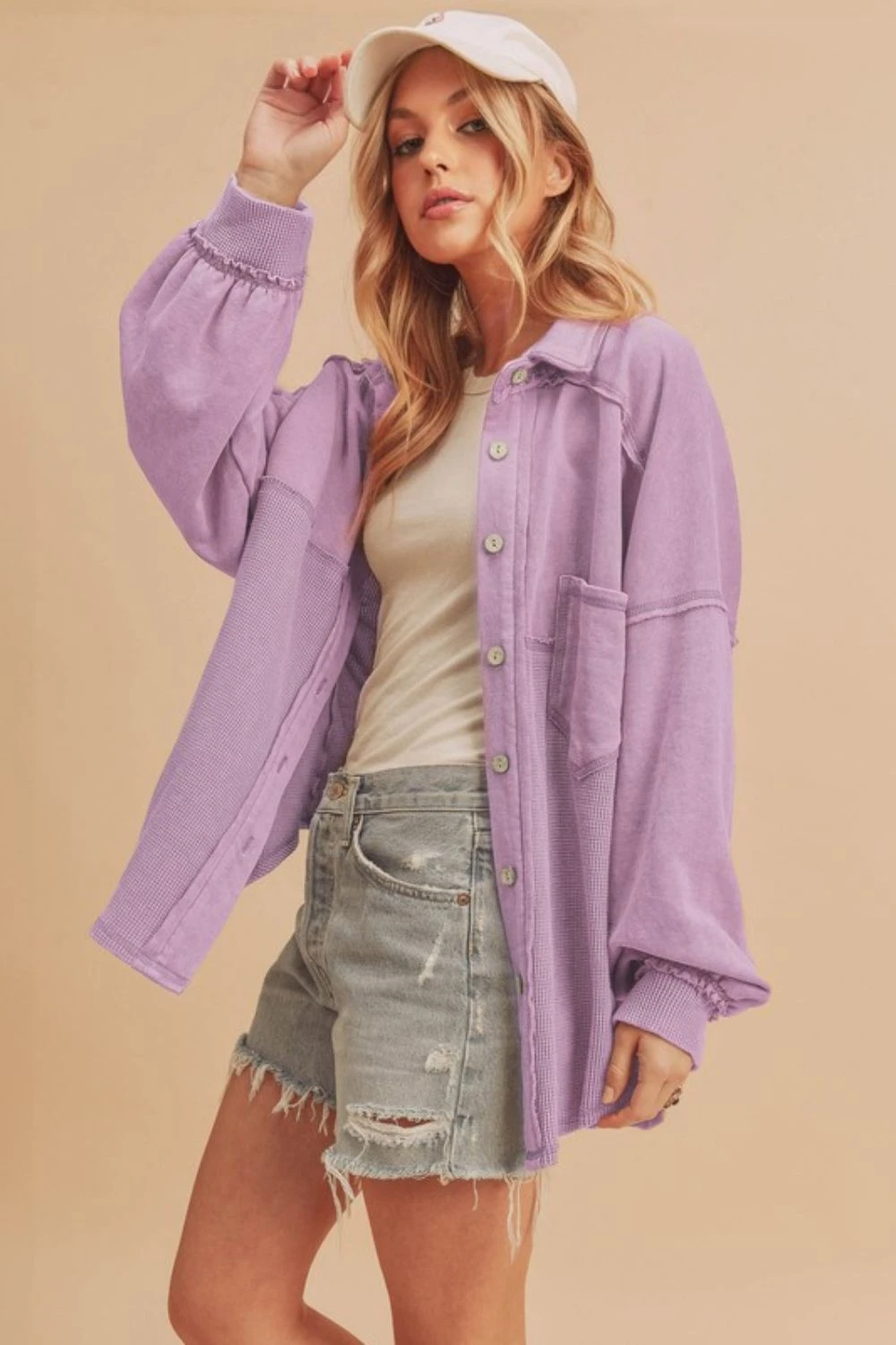 - Features: Washed, Buttoned, Waffle-Knit, Exposed seam