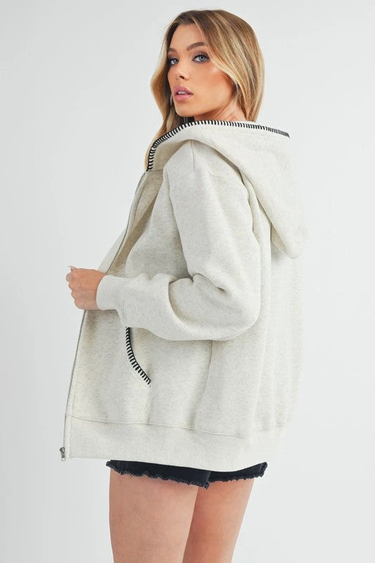 A contrast trim zip-up hoodie jacket typically features different colored or patterned trim accents that distinguish it from the main fabric of the jacket. The contrast trim adds visual interest and style to the jacket, creating a trendy and modern look. The zip-up design makes it easy to put on and take off, while the hoodie adds a casual and sporty vibe to the overall structure. This type of jacket is versatile and can be worn for various occasions, providing both warmth and style.