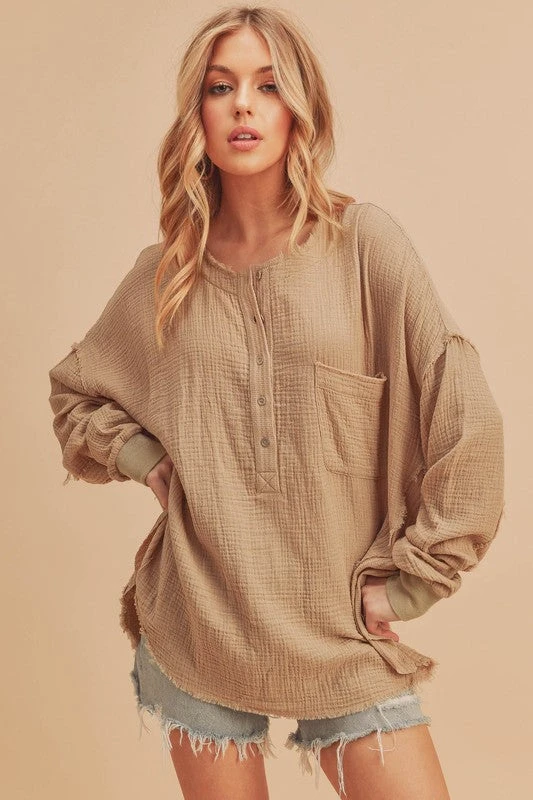 The Exposed Seam Raw Hem Half Button Top is a trendy and edgy piece that exudes casual chic style. Featuring exposed seams, it adds a unique and modern touch to the design. The raw hem detail gives the top a laid-back and effortless vibe. The half-summary front allows for versatile styling options, whether worn fully summaryed up or partially open. This top is a stylish choice for creating a relaxed yet stylish look that can be dressed up or down with ease.