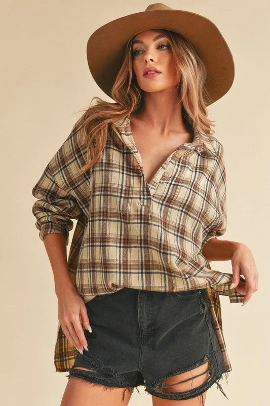 The Side Slit High-Low Plaid Long Sleeve Polo Shirt combines classic and modern elements for a stylish and contemporary look. This shirt features a plaid pattern that adds a timeless touch to the design. The high-low hem with side slits adds a modern and stylish twist to the traditional polo shirt silhouette. With long sleeves, it offers versatility for seasonal transitions.