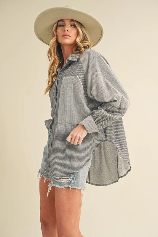 The Striped Collared Neck Lantern Sleeve Shirt is a sophisticated and stylish choice for any occasion. The shirt features a classic striped pattern that adds a touch of elegance. The collared neck adds a polished and chic look, suitable for both formal and casual settings. The lantern sleeves add a trendy and modern twist to the traditional shirt design, making it a versatile and fashionable piece for your wardrobe.