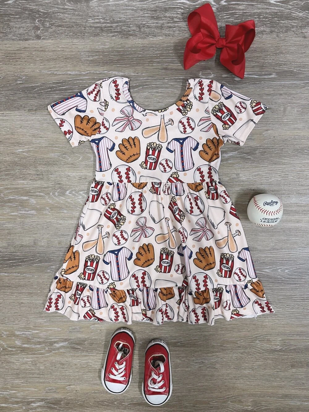 Hit a fashion home run in our All-American Day at the Ballpark Girls Baseball Dress. Decorated with popcorn, mitts, baseballs, and more, this comfy cotton-blend outfit is perfect for baseball games and backyard BBQs. Ruffle details and sporty vibes make it a summertime favorite. And be sure to check out our other must have new arrivals.