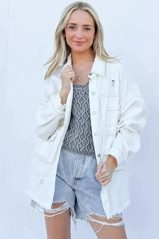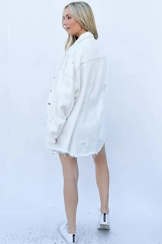 - Features: Oversized, Distressed, Buttoned, Raw Hem, Pocketed