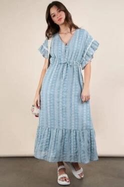 The ruffle sleeve front smocked tiered midi dress is a charming and stylish option for a romantic and feminine look. The ruffle sleeves add a whimsical touch to the dress, while the smocked detailing on the front creates a flattering and comfortable fit. The tiered design gives the dress a flowy and bohemian vibe, perfect for a variety of occasions. This dress is a versatile choice that effortlessly combines elegance with a relaxed and trendy aesthetic.