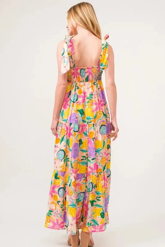 The shoulder strap tropical fruit printed tiered maxi dress is a vibrant and stylish choice for warm weather days. The tropical fruit print adds a fun and playful touch to the dress, perfect for summer outings. The shoulder straps provide comfort and a flattering fit, while the tiered design adds a flowy and relaxed silhouette. This maxi dress is perfect for adding a pop of color to your wardrobe and can be dressed up or down with ease. Pair it with sandals and a straw hat for a casual and chic summer look.