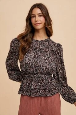 The Abstract Print Balloon Sleeve Peplum Blouse is a chic and statement-making piece. It features a stylish abstract print design. The balloon sleeves add a touch of drama and volume to the blouse. The peplum silhouette creates a flattering and feminine shape, making it a versatile and eye-catching top for various occasions.