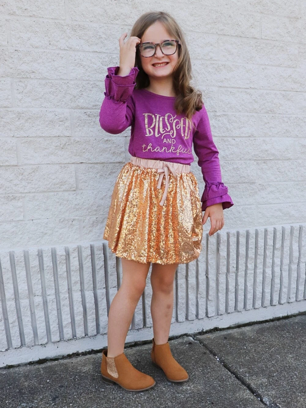 Bless your pretty little girl with our adorable Blessed & Thankful Purple Gold Sequin Ruffle Girls Skirt Outfit! This adorable outfit comes with a purple long sleeve shirt that features the phrase: “blessed and thankful” in gold sparkles and ruffle sleeves. The set also comes with a stylish gold sequin ruffle skirt. We are loving this outfit with a pair of boots and a coordinating hair bow. This set is perfect for a day at school, Thanksgiving dinner, playdates, family parties, and so much more! Pick up this fall dress while your little’s size is still in stock and be sure to checkout our other new fall arrivals.