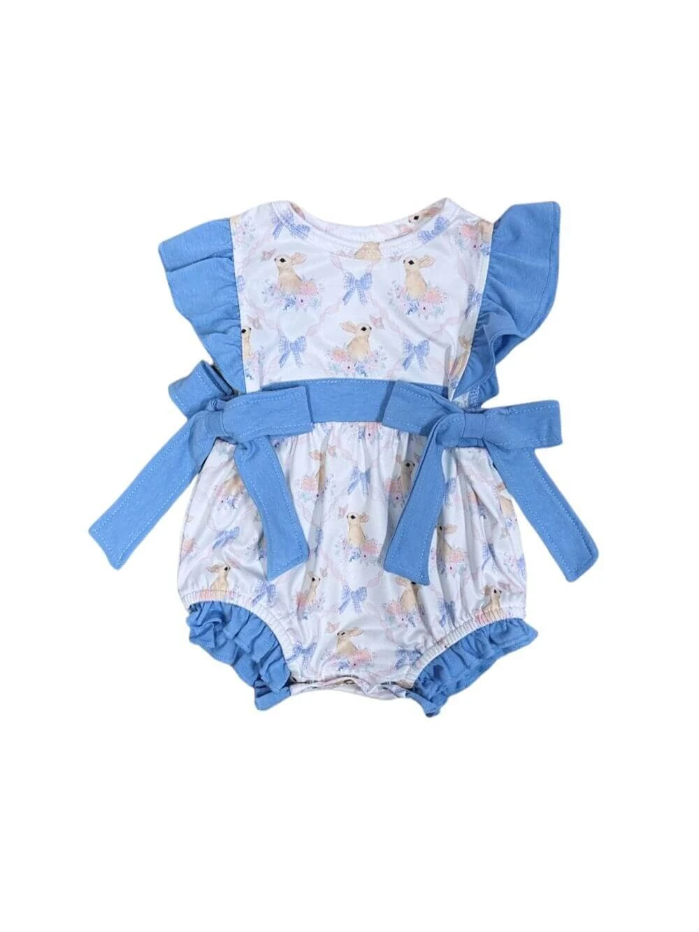 Our Blue Bow Bunny Spring Baby Bubble Romper is the perfect blend of sweet and stylish for your little one. This white romper features an adorable bunny print, charming blue ruffle trim, and delightful blue bow details. Designed with snaps for easy changing, it’s a must-have for spring festivities and Easter celebrations. Comfortable, cute, and picture-perfect! And be sure to check out our other must have new arrivals.