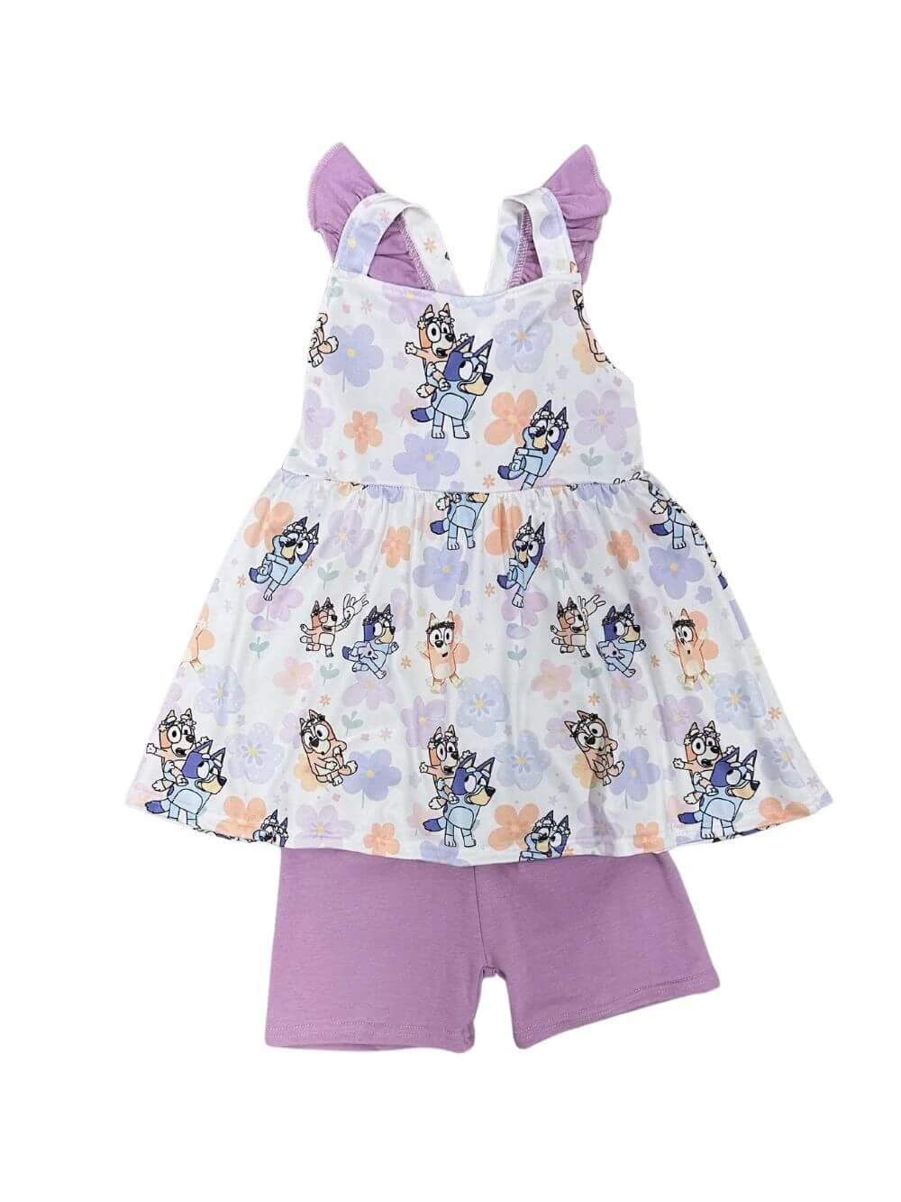Dress your little one in whimsical charm with our Blue Dog Criss Cross Tank Girls Lavender Shorts Outfit. The adorable criss-cross detail tank showcases a playful blue dog graphic, while the lavender shorts add a sweet touch. Perfect for sunny days, this ensemble offers both style and comfort, ensuring your little girl looks cute and feels great during her adventures. And be sure to check out our other must have new arrivals.