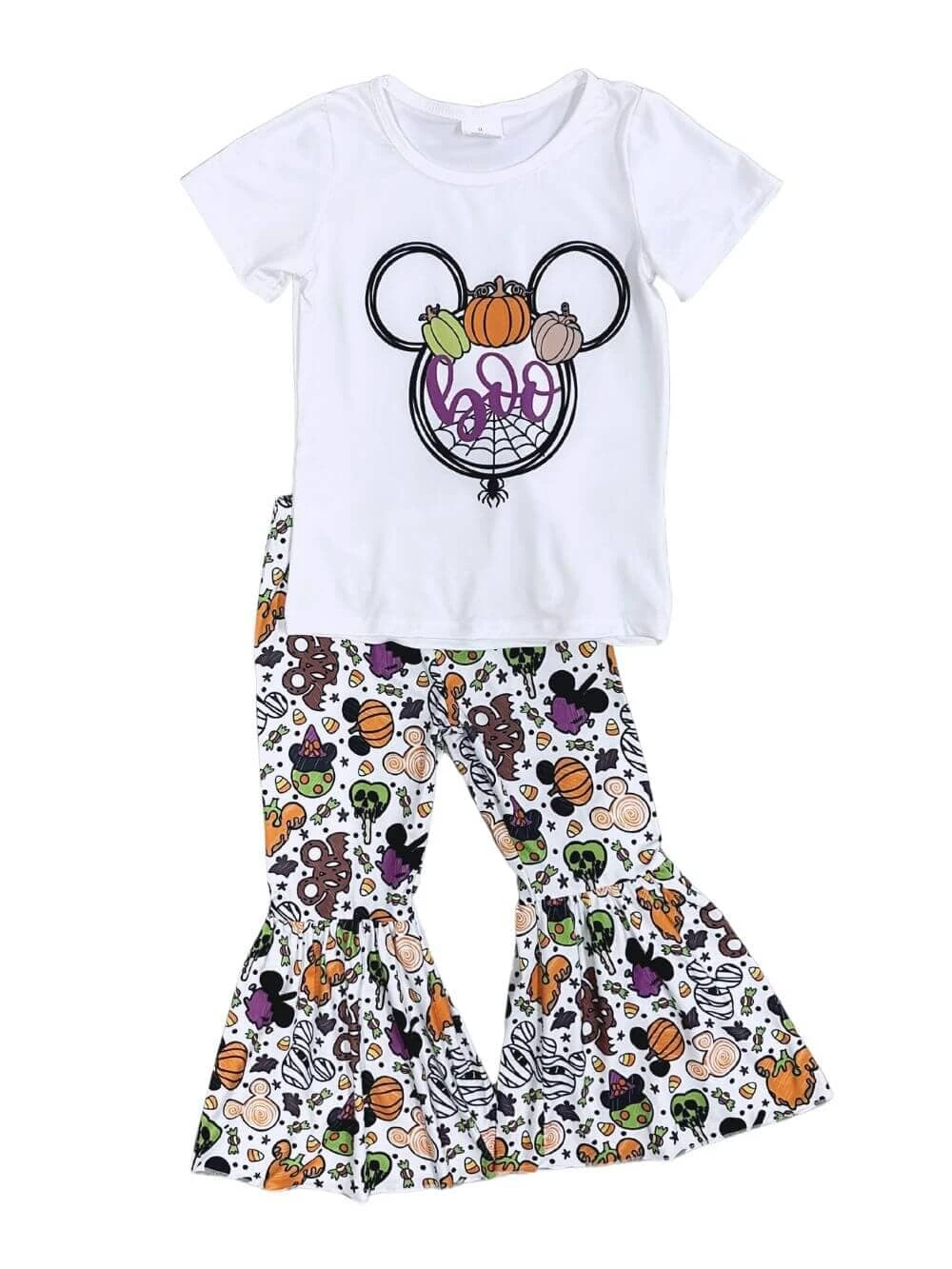 Your little one will love our Boo Mouse Not So Scary Halloween Girls Bell Bottom Outfit! This charming set features a short sleeve white top with an adorable mouse graphic, perfect for Halloween fun. The vibrant purple bell bottom pants are adorned with playful Halloween characters, making this outfit a festive and stylish choice for the spooky season. And be sure to check out our other must have new arrivals.