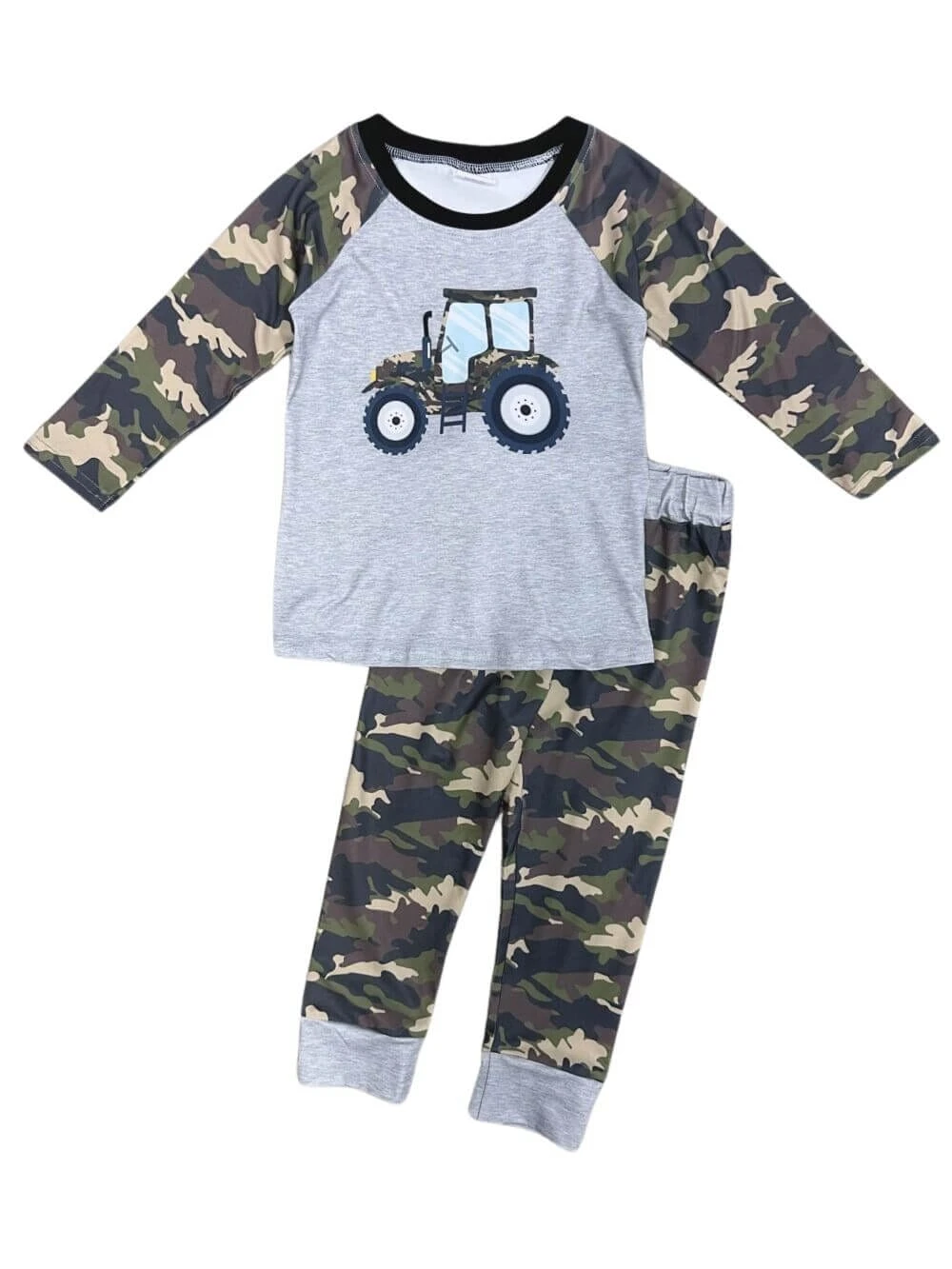 Gear up your little farmer with our Camo Tractor Boys Long Sleeve Jogger Outfit! The stylish raglan top features camo sleeves and a bold tractor graphic, while the matching camo joggers add a coordinated touch. Perfect for active kids who love the outdoors, this set offers comfort and rugged charm for playtime or casual outings. A must-have for tractor fans! And be sure to check out our other must have new arrivals.
