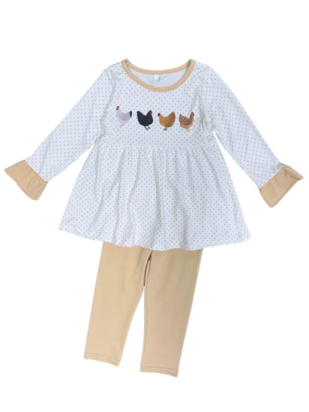 Get ready to dance with our Chicken Dance Long Sleeve Top & Leggings Girls Outfit. Featuring a playful design with four chickens across the chest and tan trim, this white long sleeve top pairs perfectly with matching tan leggings. Comfortable and fun, it’s ideal for casual days or holiday celebrations with a lighthearted, farm-inspired look. And be sure to check out our other must have new arrivals.