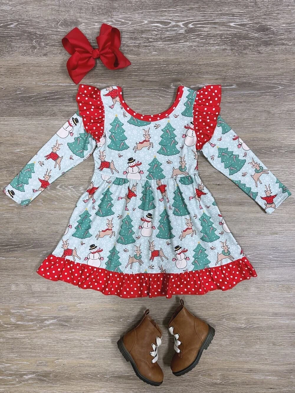 Our Christmas Dreams Reindeer & Snowman Ruffle Trim Girls Dress is perfect for holiday festivities! This green dress features an adorable print of reindeer and snowmen, creating a festive look she’ll love. Accented with a playful red polka dot ruffle trim, it’s a delightful outfit choice for celebrating the season with charm and holiday cheer. And be sure to check out our other must have new arrivals.
