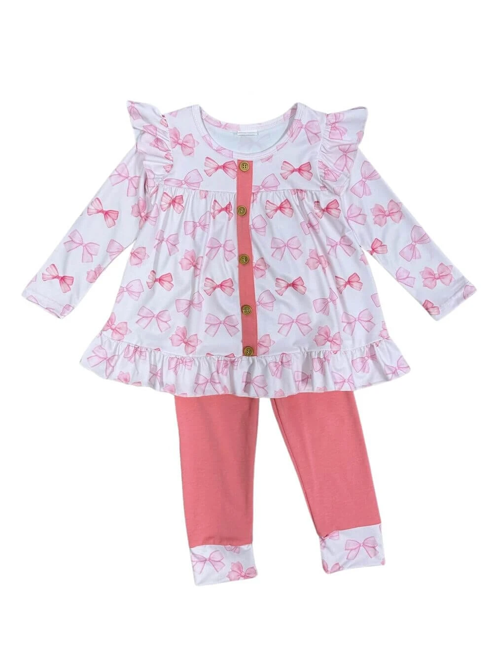 Our Coquette Bows Pink Girls Ruffle Top & Leggings Outfit is a stylish choice for any occasion. The white long sleeve top features a delicate pink bow print, paired perfectly with pink leggings adorned with charming matching trim. Designed for comfort and cuteness, this outfit is perfect for holidays, parties, or everyday wear. A must-have for your little one! And be sure to check out our other must have new arrivals.