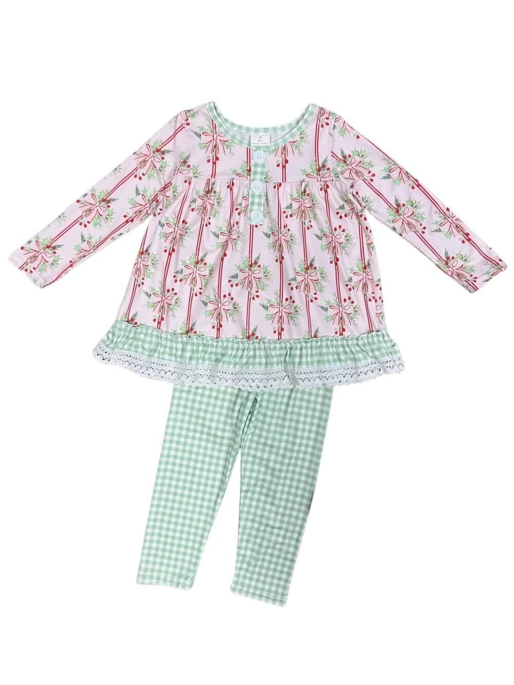 Our Coquette Christmas Bows Girls Gingham Pants Outfit features a delightful combination of style and holiday spirit. The outfit includes a charming top adorned with festive bows and comfortable gingham pants, perfect for celebrating the season. Ideal for holiday gatherings or cozy family moments, this outfit ensures your little one looks stylish while enjoying the festivities! And be sure to check out our other must have new arrivals.