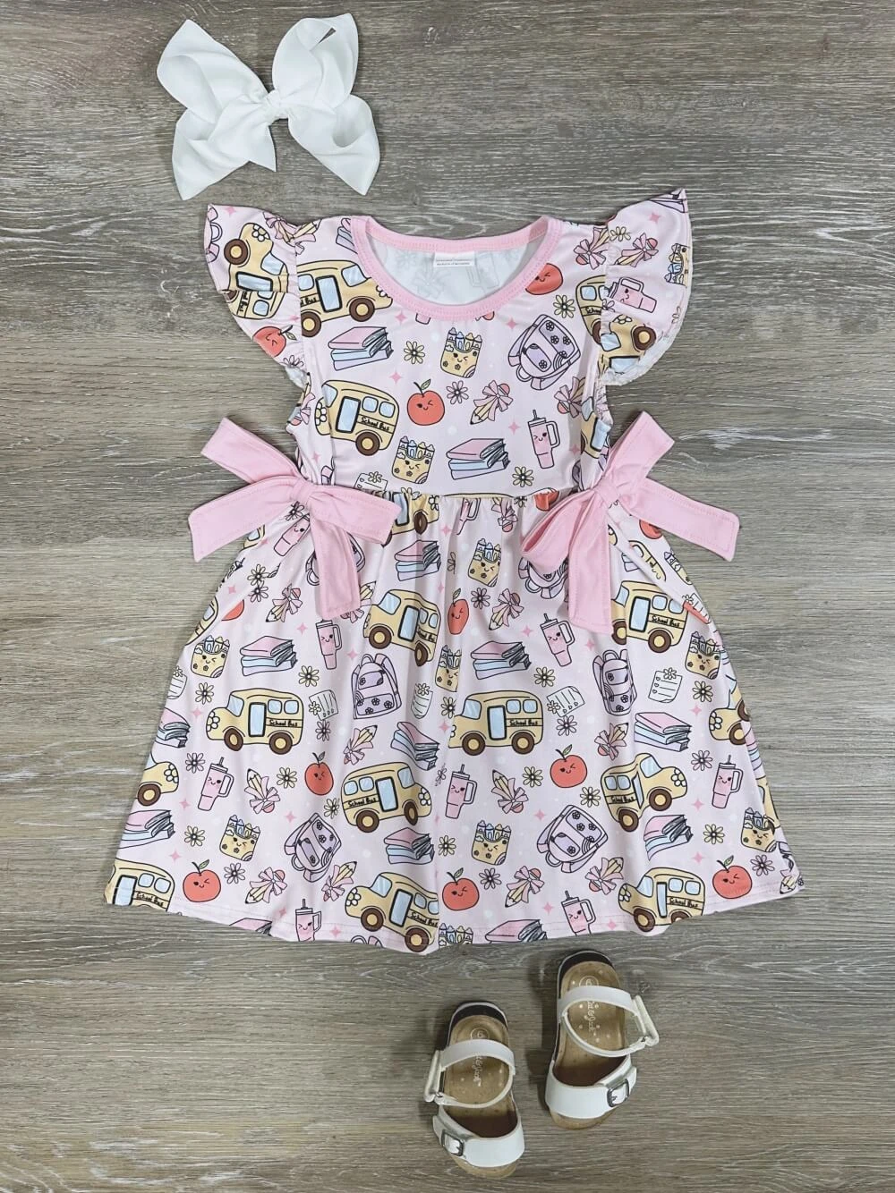 Our Coquette Classroom Cute Girls Pink Back to School Dress is full of first-day fun! With a cheerful print of buses, pastel school supplies, and girly bows, this flutter sleeve dress is perfect for any little learner. Coquette-inspired side ties complete the look for a picture-perfect start to the school year. And be sure to check out our other must have new arrivals.