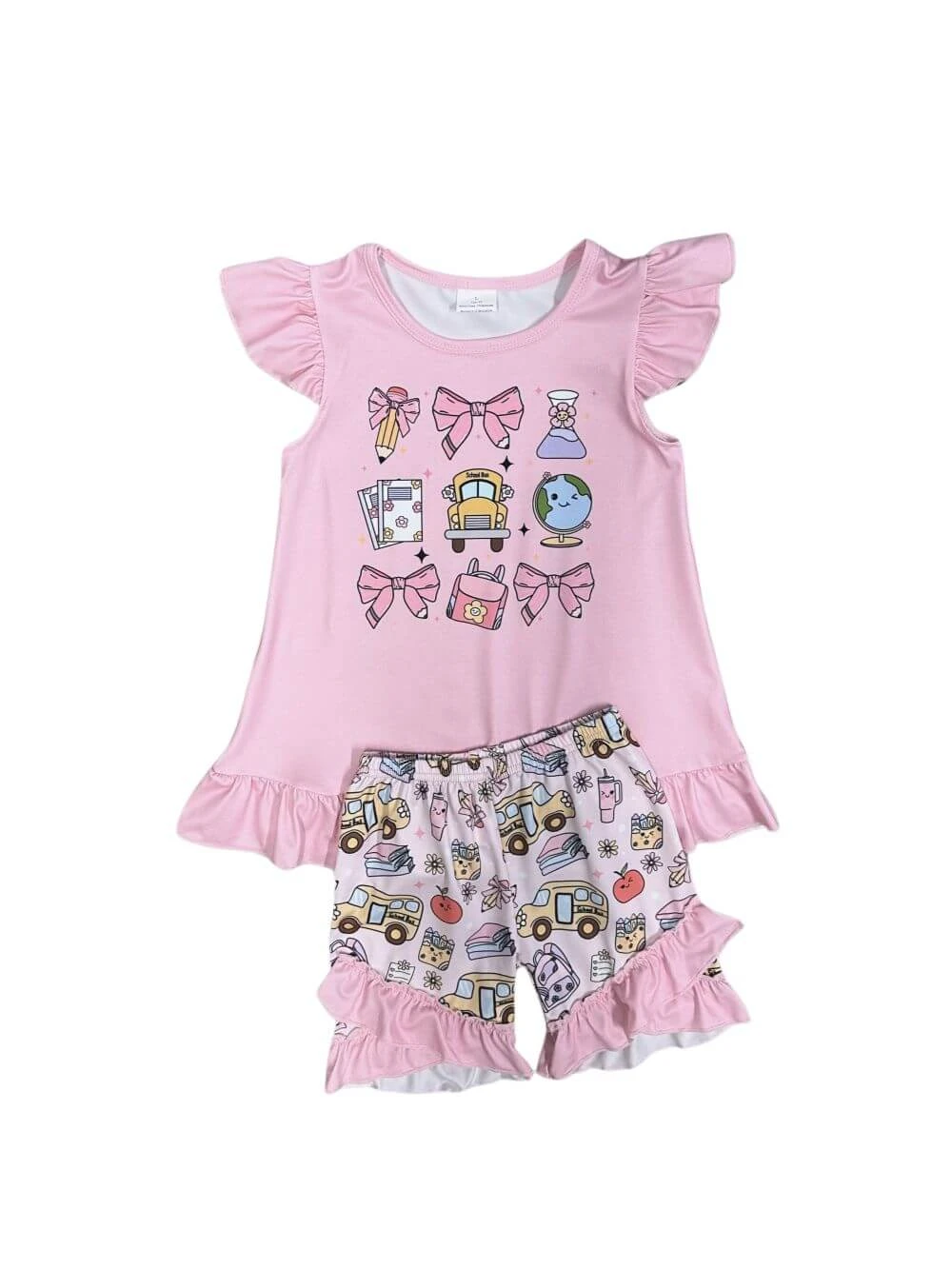 She’ll ride into the school year in style with our Coquette Classroom Girls Back to School Set! Featuring a pink flutter sleeve top with a school bus and pastel supplies, plus matching ruffle shorts, this outfit is sweet, smart, and oh-so-stylish. Perfect for preschool, playdates, and those first big day photos! And be sure to check out our other must have new arrivals.