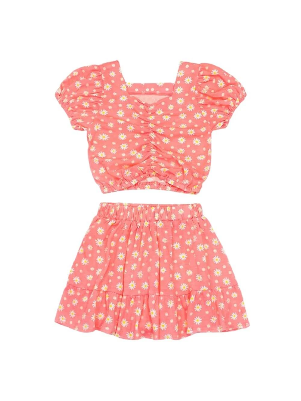 Our Coral Floral Puff Sleeve Girls Skirt Set is equal parts playful and sweet. The smocked top has puff sleeves and stretch comfort, while the flowy skirt makes twirling irresistible. Bright coral with white florals adds charm to this lightweight and easy-to-wear summer look. And be sure to check out our other must have new arrivals.
