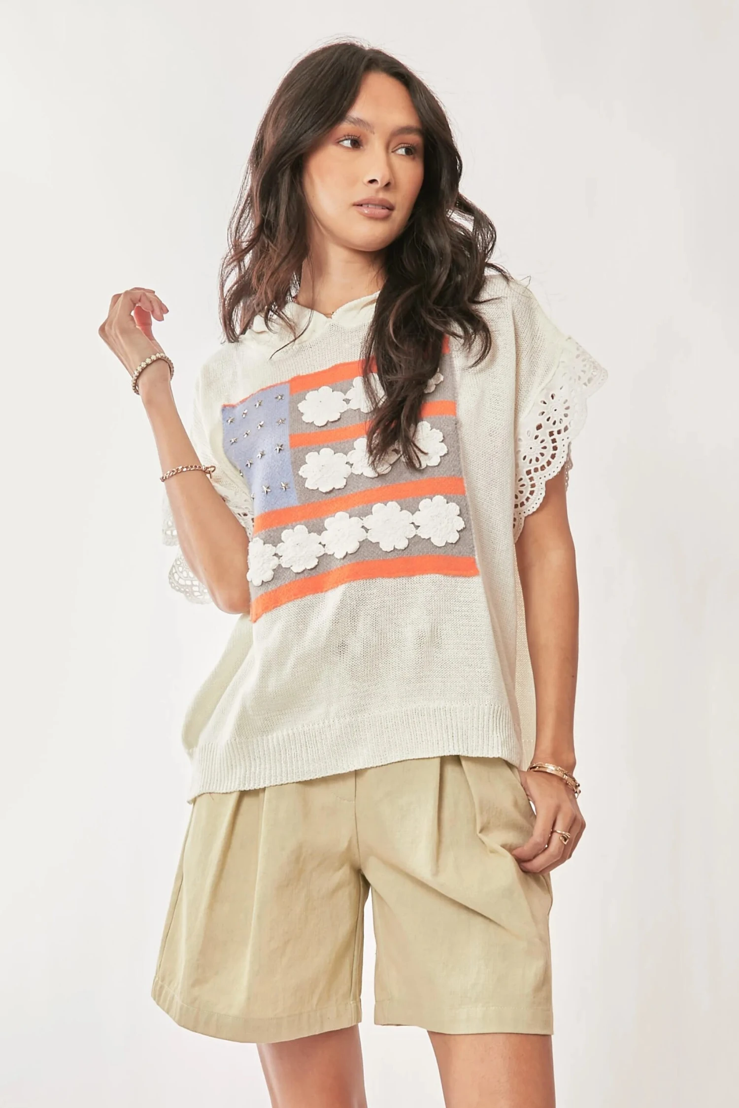 This American Flag Loose Fit Lace Sleeve Hoodie Top combines patriotic flair with trendy style. Featuring an eye-catching American flag design, this top is both festive and fashionable. The lace sleeves add a touch of glamour and femininity to the relaxed and comfy hoodie silhouette. Perfect for showing off your pride in style during any casual occasion.