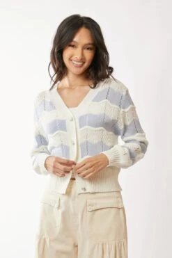 This charming cardigan features a beautiful wave-striped pattern in light blue and white, creating a fresh and elegant look. Made from high-quality knit material, it offers both comfort and style. The cropped length and summary-up design make it versatile for various outfits. The balloon sleeves add a modern touch while the ribbed trim provides a polished finish. Perfect for spring and summer layering, this cardigan combines classic style with contemporary details. The lightweight construction makes it ideal for seasonal transitions.