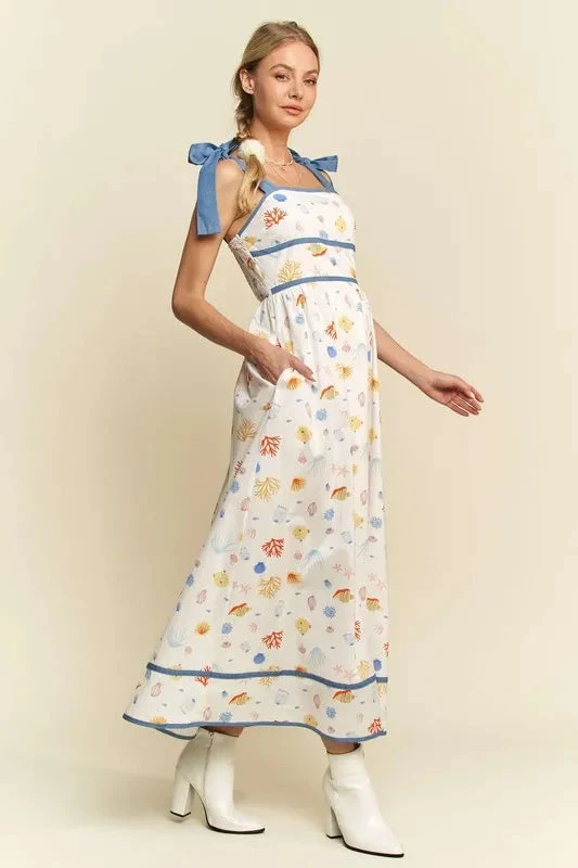 A denim binding detail smocking summer maxi dress is a stylish and flattering piece for warm weather. The smocking detail adds texture and a comfortable fit to the dress, while the denim binding adds a casual and trendy touch. This maxi dress is perfect for a day out or a casual summer event. Pair it with sandals and a sun hat for a chic and effortless look.