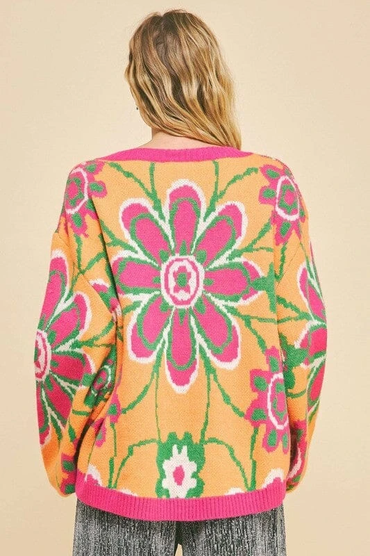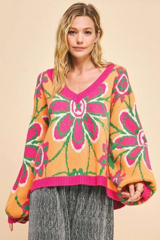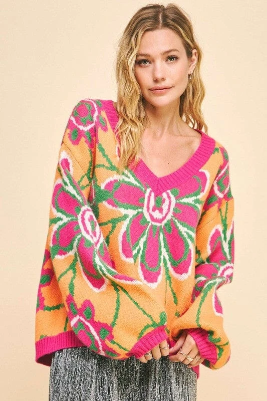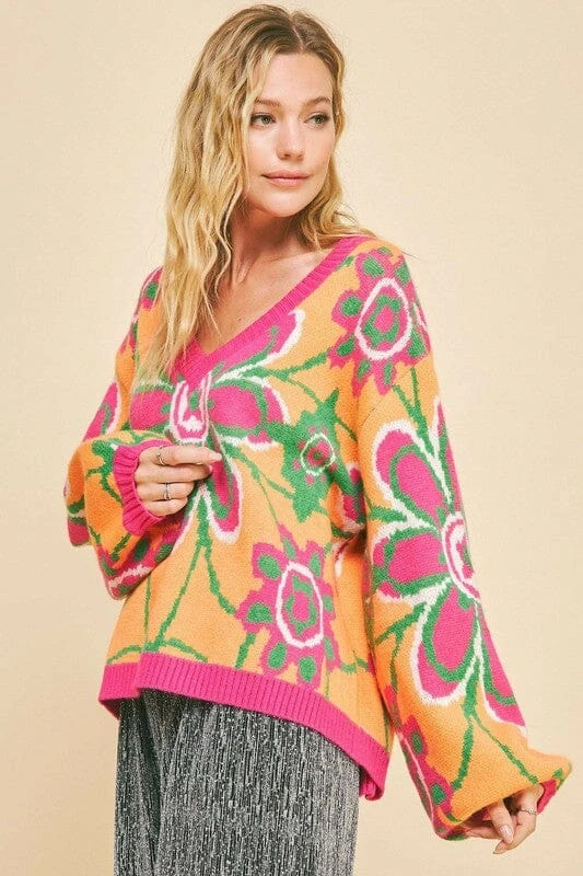 This floral contrast V-neck dropped shoulder sweater is a charming and stylish addition to your wardrobe. The floral pattern adds a feminine and fresh touch to the classic V-neck design. With a dropped shoulder silhouette for a relaxed and comfortable fit, this sweater is perfect for adding a pop of color and print to your outfits. Ideal for adding a chic and on-trend flair to your look.