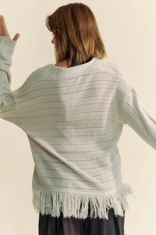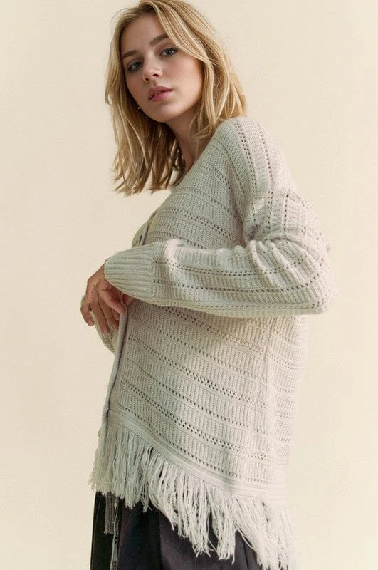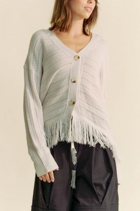 This fringe V-neck summary-up long sleeve cardigan is a stylish addition to any wardrobe. The fringed trim adds a playful and bohemian touch to the classic V-neck design. The summary-up front allows for easy layering and styling options, while the long sleeves provide extra warmth and comfort. Perfect for adding a trendy touch to your outfit.