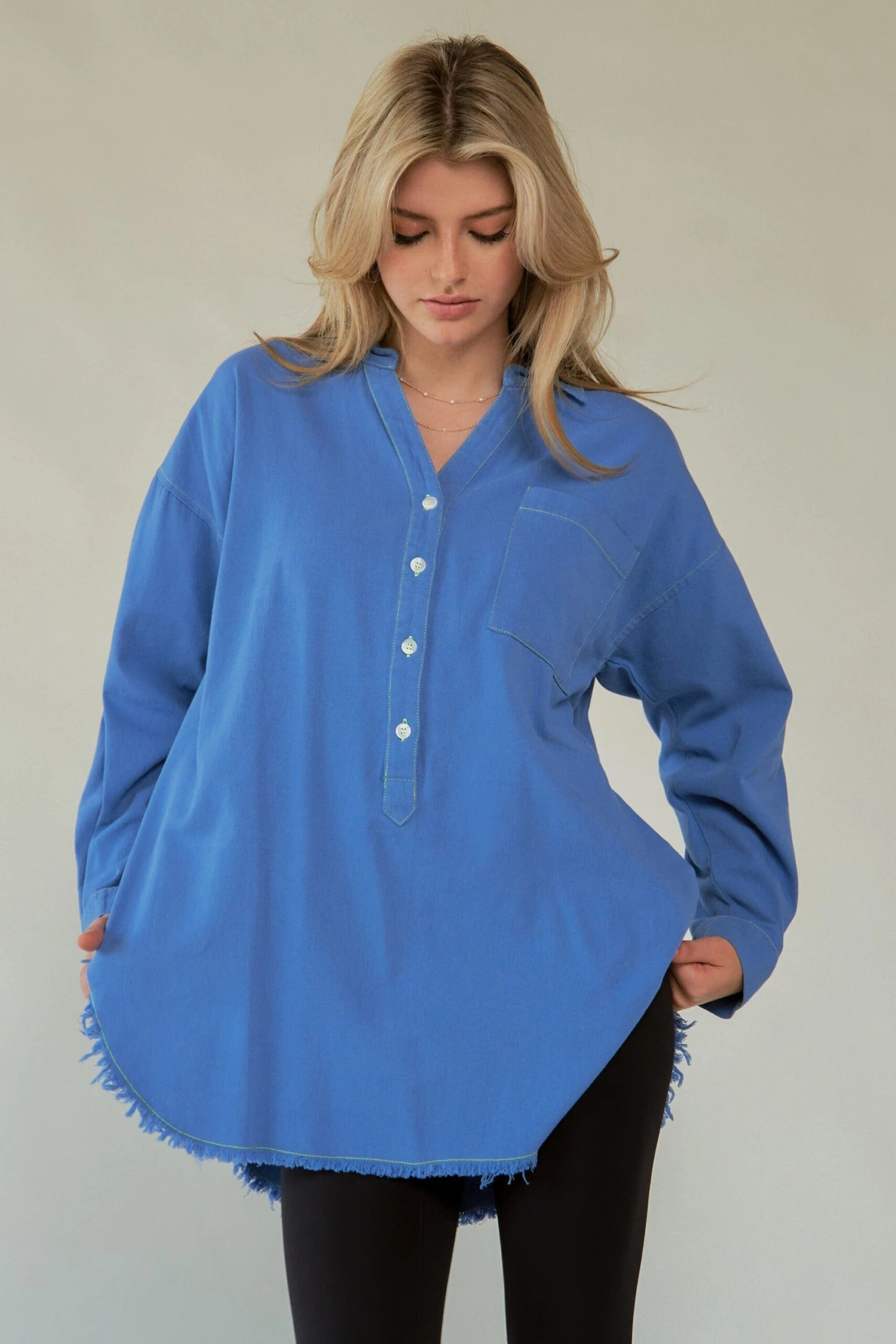 - Features: Raw Hem, Buttoned, Pocketed
