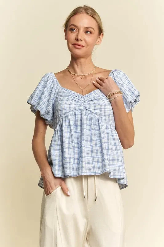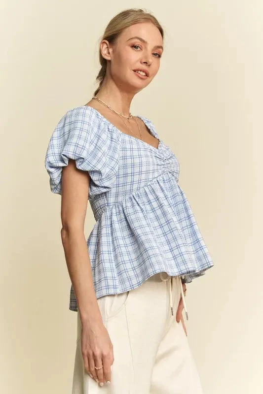 The Plaid Puff Sleeves Ruffled Smocked Blouse is a charming and stylish top that combines trendy details for a feminine look. The plaid pattern adds a classic and timeless touch to the blouse, while the puff sleeves provide a romantic and whimsical flair. The ruffled smocked detailing offers texture and a flattering fit. This blouse is versatile and can be dressed up with a skirt or trousers for a polished outfit, or paired with jeans for a more casual vibe. Perfect for adding a touch of sophistication to your ensemble, this blouse is a chic and on-trend choice for various occasions.