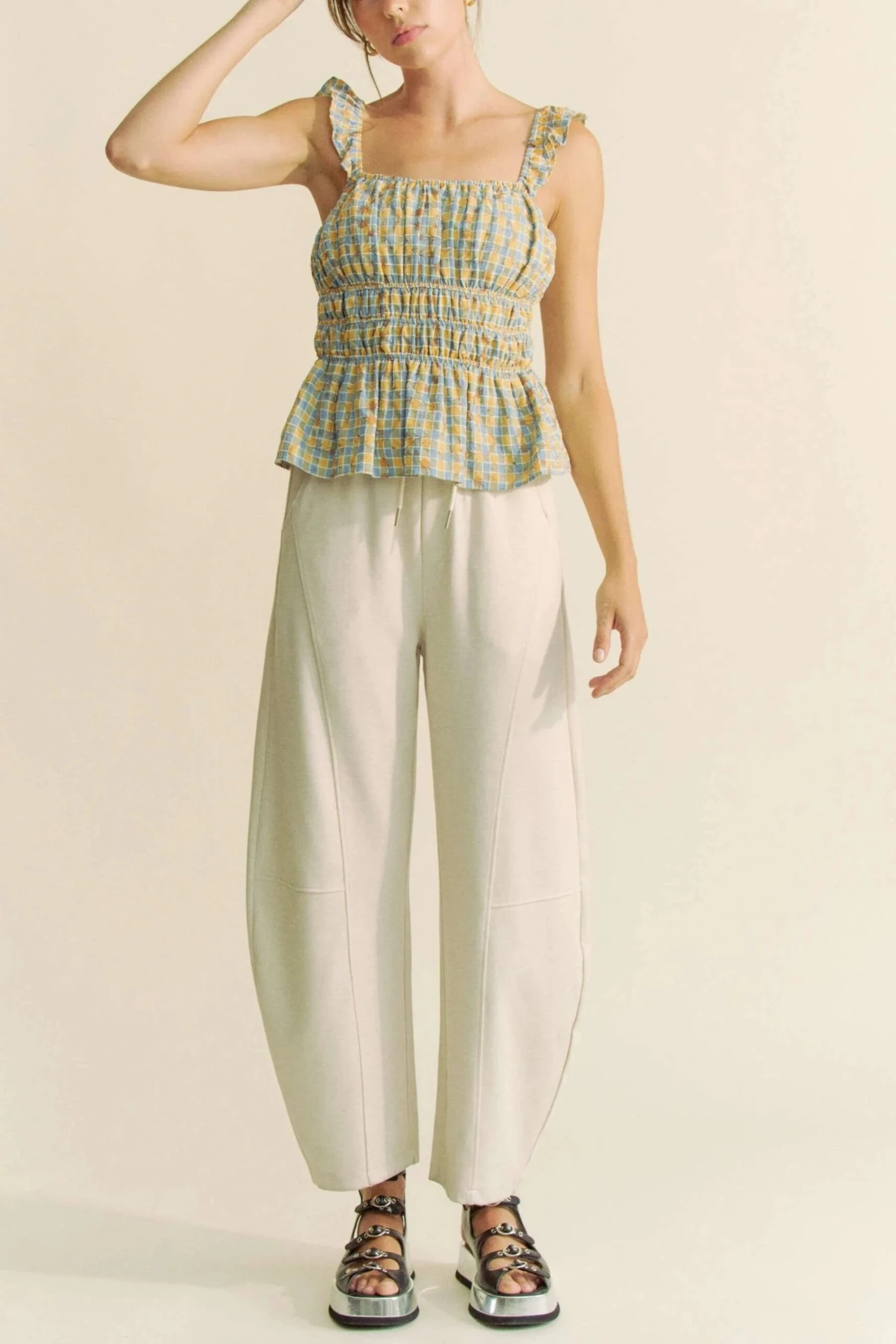 This Plaid Ruffled Strap Smocked Sleeveless Top combines classic plaid with trendy details for a stylish look. The ruffled straps add a touch of femininity, while the smocked bodice provides a flattering and comfortable fit. Perfect for a casual yet chic ensemble, this sleeveless top is a versatile piece that can be dressed up or down for different occasions.