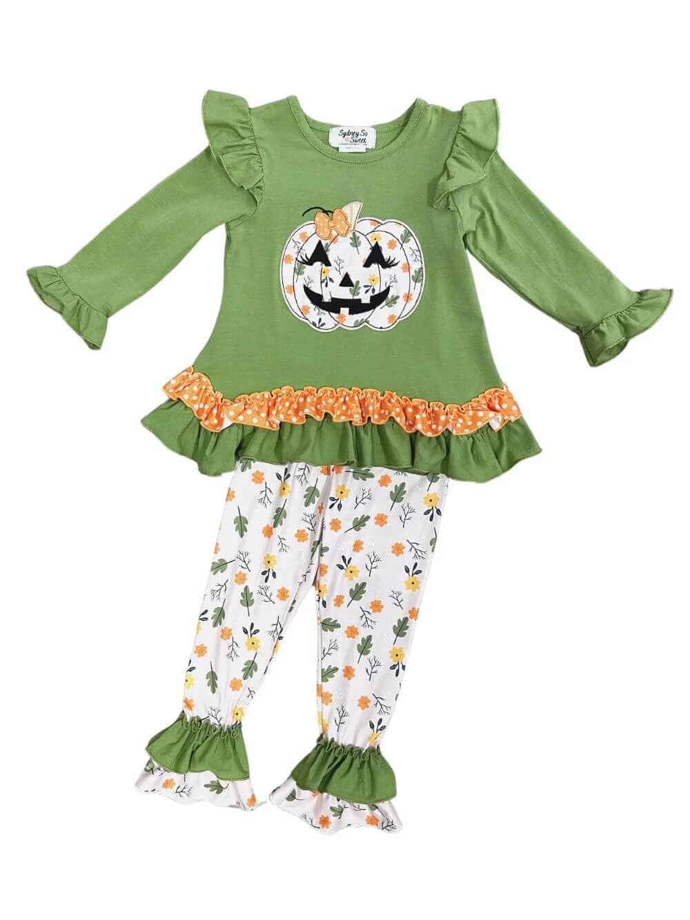 Dress your little one in fall charm with our Fall Ruffle Jack-O-Lantern Tunic & Leggings Girls Outfit. The green tunic top features a playful jack-o-lantern, perfectly paired with leaf print leggings adorned with ruffles at the ankles. Ideal for Halloween fun and autumn outings, this outfit combines seasonal style with cozy comfort. And be sure to check out our other must have new arrivals.