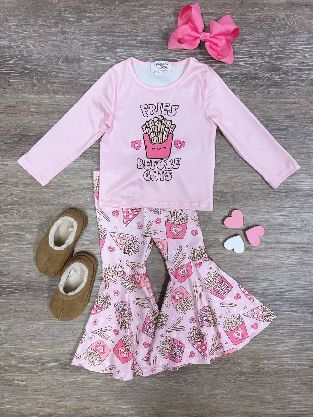 We all know the classic saying, fries before guys! Show it off with our adorable Fries Before Guys Pink Hearts Girls Bell Bottom Outfit! The set comes with a pink long sleeve top with pinked out french fries and the saying: “fries before guys”. The set also comes with a pair of coordinating pink french fry themed bell bottoms with an elastic waist. We love this outfit with a cute pair of boots and a matching pink hair bow. The set is perfect for school days, playdates with friends, Valentines Day parties, and so much more! Be sure to also checkout our other must have new arrivals.