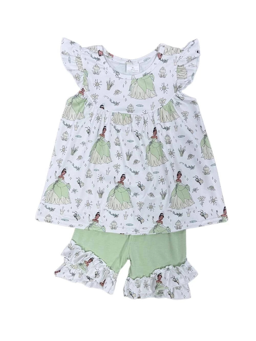 Hop into style with our Frog Princess Light Green Girls Ruffle Trim Shorts Outfit. Adorned with a charming frog princess graphic, the light green top adds a touch of enchantment to any day. Paired with ruffle-trim shorts, this outfit is as adorable as it is comfortable, perfect for your little princess’s everyday adventures in the kingdom of play. And be sure to check out our other must have new arrivals.