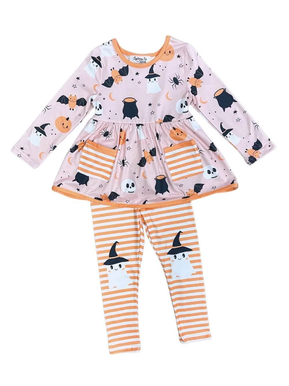 Get your little one Halloween-ready with our Ghost Witch Knee Patch Girls Long Sleeve Outfit. This adorable set features a pink and orange tunic top paired with striped leggings adorned with cute witch ghost patches on the knees. Perfect for festive fun, this outfit combines spooky charm with playful comfort, making it ideal for Halloween celebrations. Â And be sure to check out our other must have new arrivals.
