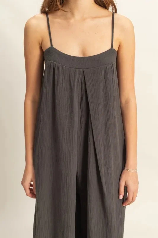 The Double Gauze Super Flowy Cami Jumpsuit is a breezy and chic outfit option. The double gauze fabric offers a light and airy feel, perfect for warmer weather. The cami-style top adds a relaxed and casual vibe to the jumpsuit. The flowy silhouette provides comfort and movement. This jumpsuit is ideal for a day out or a casual gathering, offering a stylish and effortless look. Pair it with sandals and a sunhat for a laid-back summer ensemble that is both comfortable and fashionable.