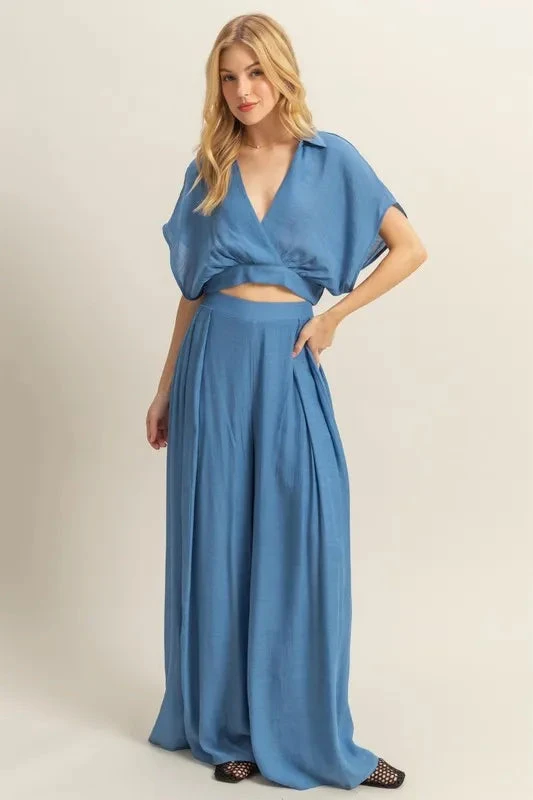 This Kimono Sleeve Crop Top and Wide Leg Pants Set is a stylish and modern outfit choice. The kimono sleeves on the crop top add a touch of elegance and flowy movement. Paired with the wide-leg pants, this set offers a trendy and chic silhouette that is perfect for various occasions. The combination of the kimono sleeves and wide-leg pants creates a fashionable and comfortable ensemble that can be easily dressed up or down.
