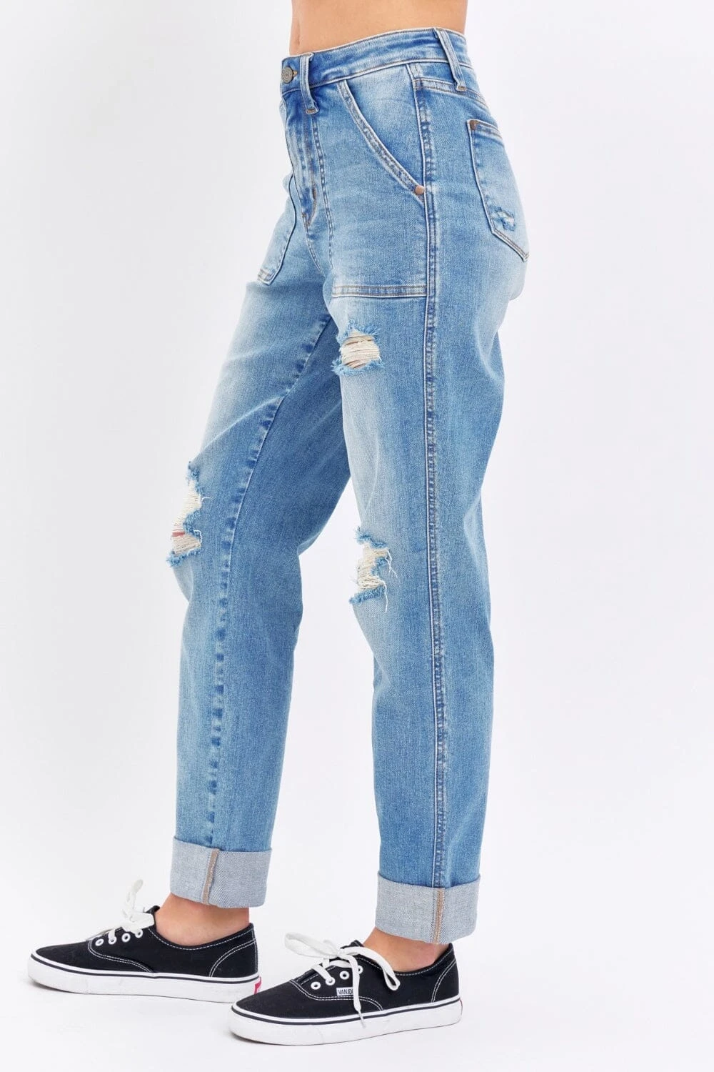 These distressed straight jeans feature stylish patch pockets for added flair. The distressed detailing adds a trendy touch to your look. The straight cut offers a flattering silhouette. Pair these jeans with a simple blouse for a casual-chic outfit. The patch pockets provide both functionality and style. Elevate your denim game with these on-trend jeans.