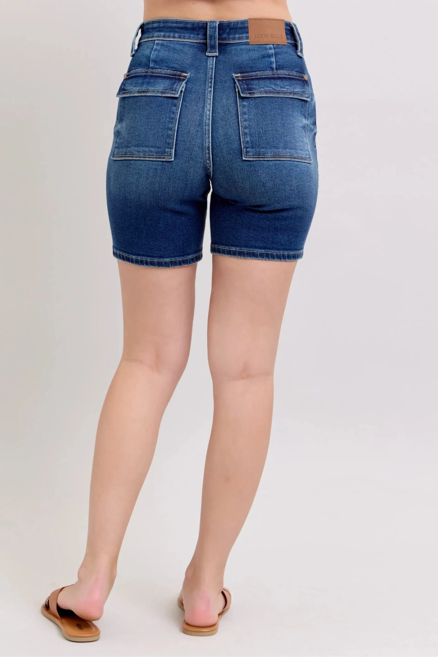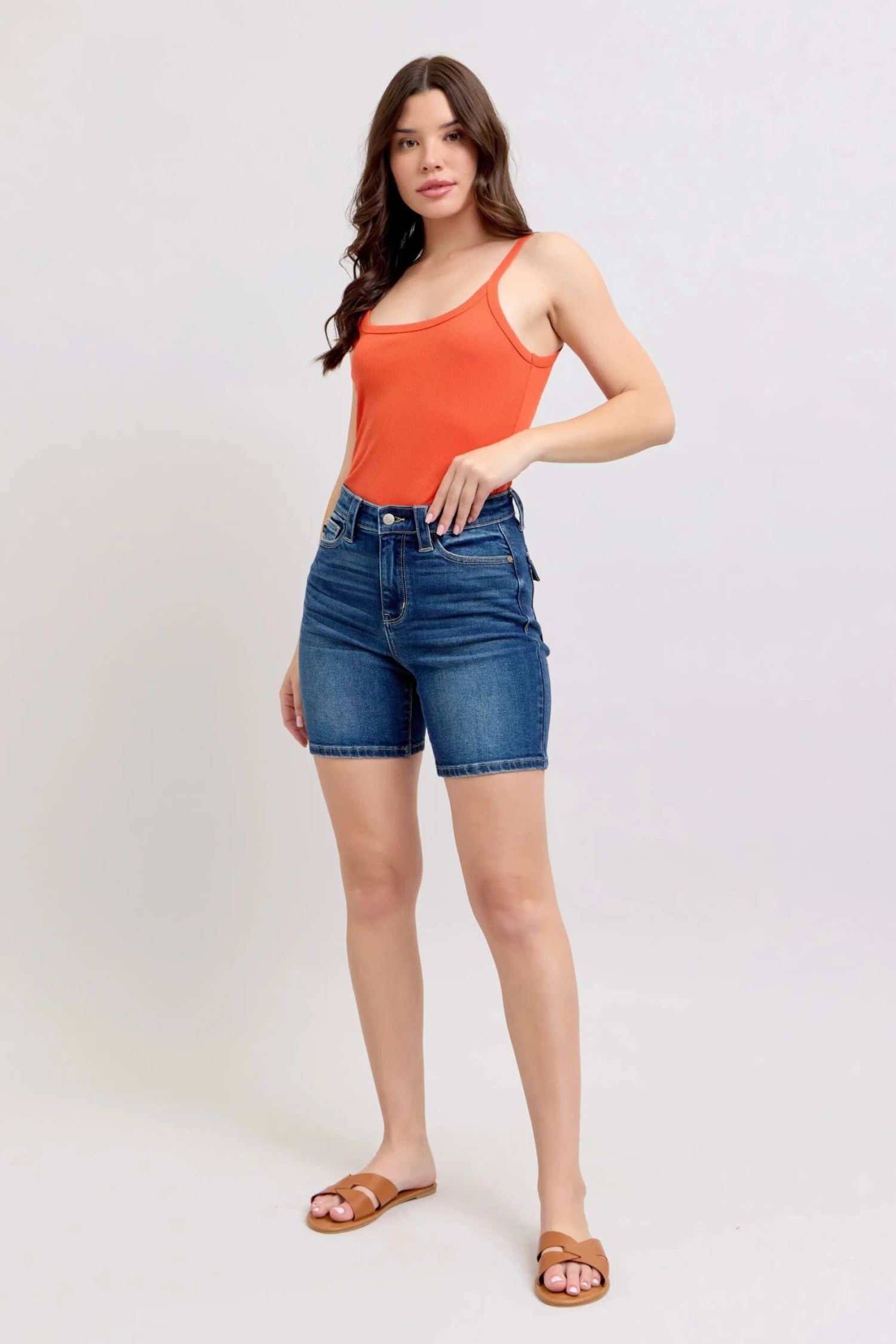 These premium high-waisted denim shorts feature a classic mid-blue wash with subtle fading for a timeless look. Crafted from high-quality stretch denim blend (likely 98% cotton, 2% elastane), they offer exceptional comfort and flexibility while maintaining their shape. The high-rise waist creates a flattering silhouette that elongates the legs, while the mid-thigh length provides modest coverage. Perfect for casual summer outfits, these versatile shorts can be dressed up with heels or down with sneakers. The traditional 5-pocket design and authentic denim detailing make them a wardrobe essential.