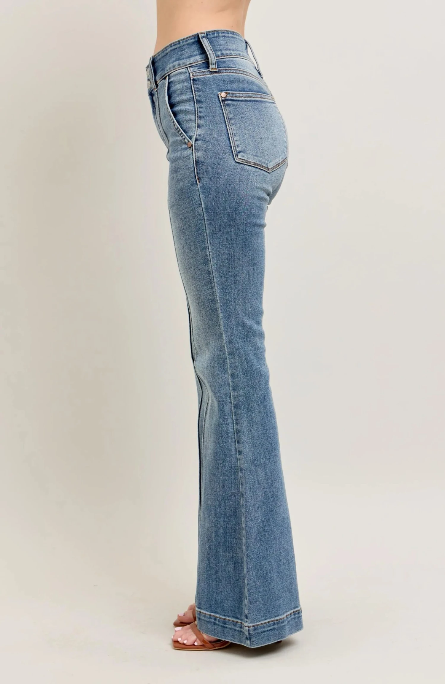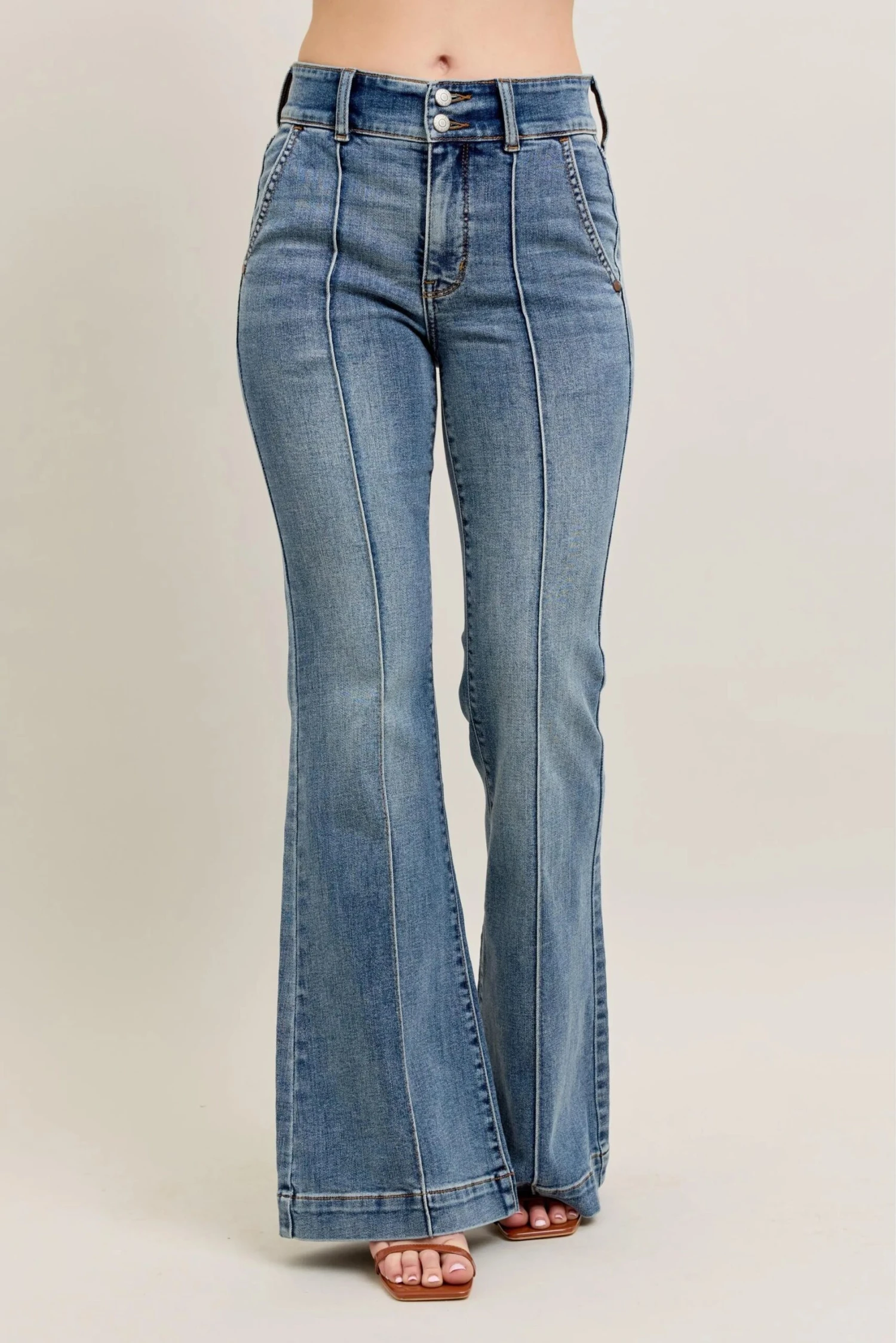 These premium Judy Blue flare jeans feature a flattering high-waist design perfect for plus size figures. Made from high-quality stretch denim in a versatile medium wash, these jeans showcase unique front seam detailing that creates an elongating effect. The flared silhouette provides a balanced look while the double summary closure ensures a secure fit. The comfortable stretch fabric moves with you while maintaining its shape throughout wear. These jeans combine vintage-inspired styling with modern comfort and fit features.