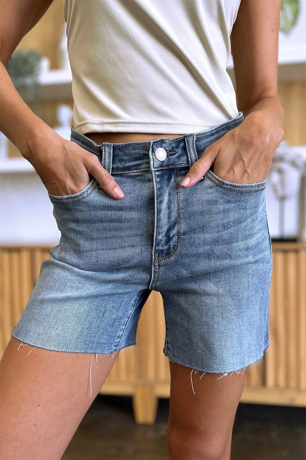 High Waist Raw Hem Denim Shorts are a must-have for the summer season. The high waist design is both stylish and flattering. The raw hem adds a touch of edge and casual charm to the shorts. Perfect for creating effortless and trendy outfits. These shorts can be easily dressed up or down for any occasion. Stay cool and stylish in these High Waist Raw Hem Denim Shorts!