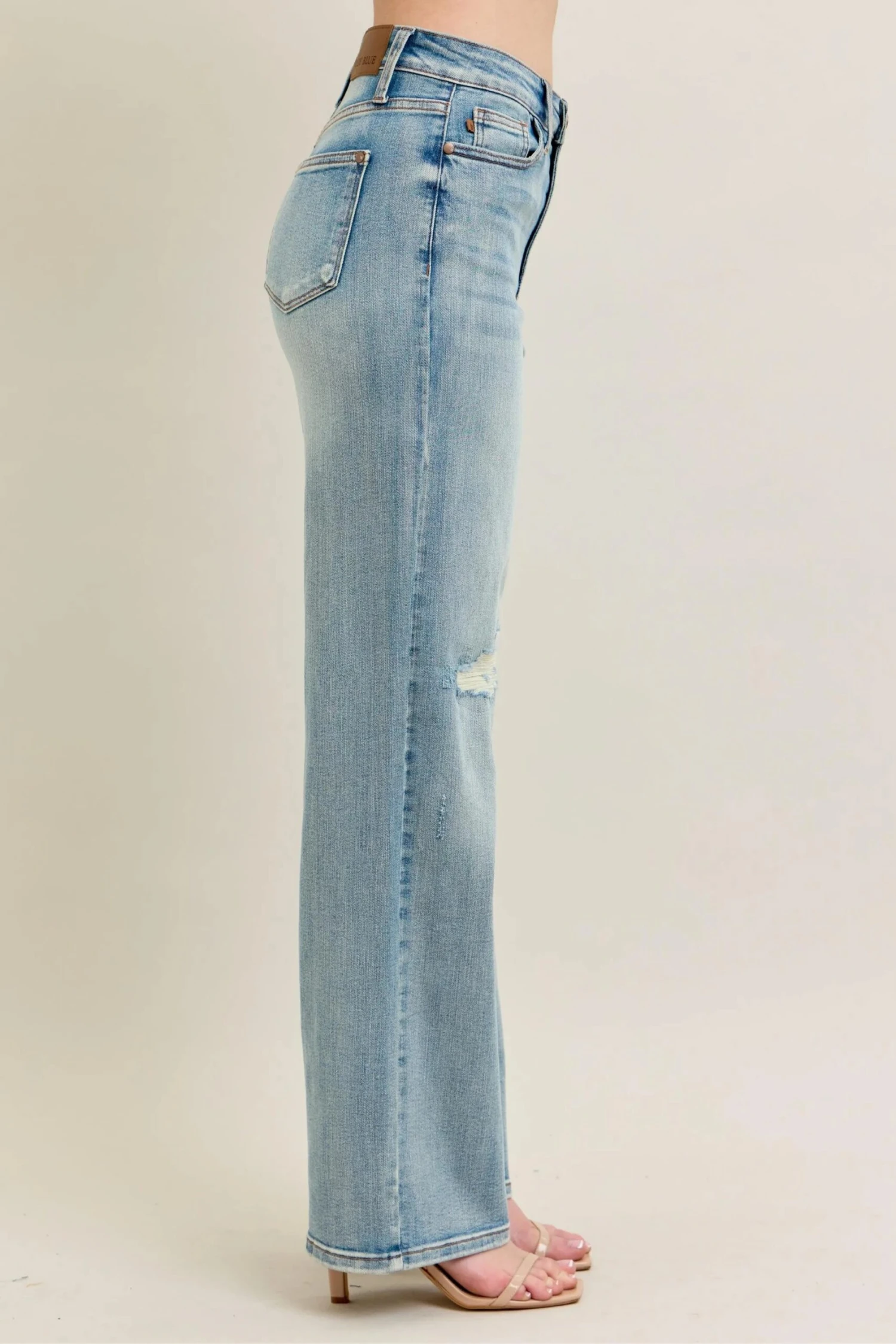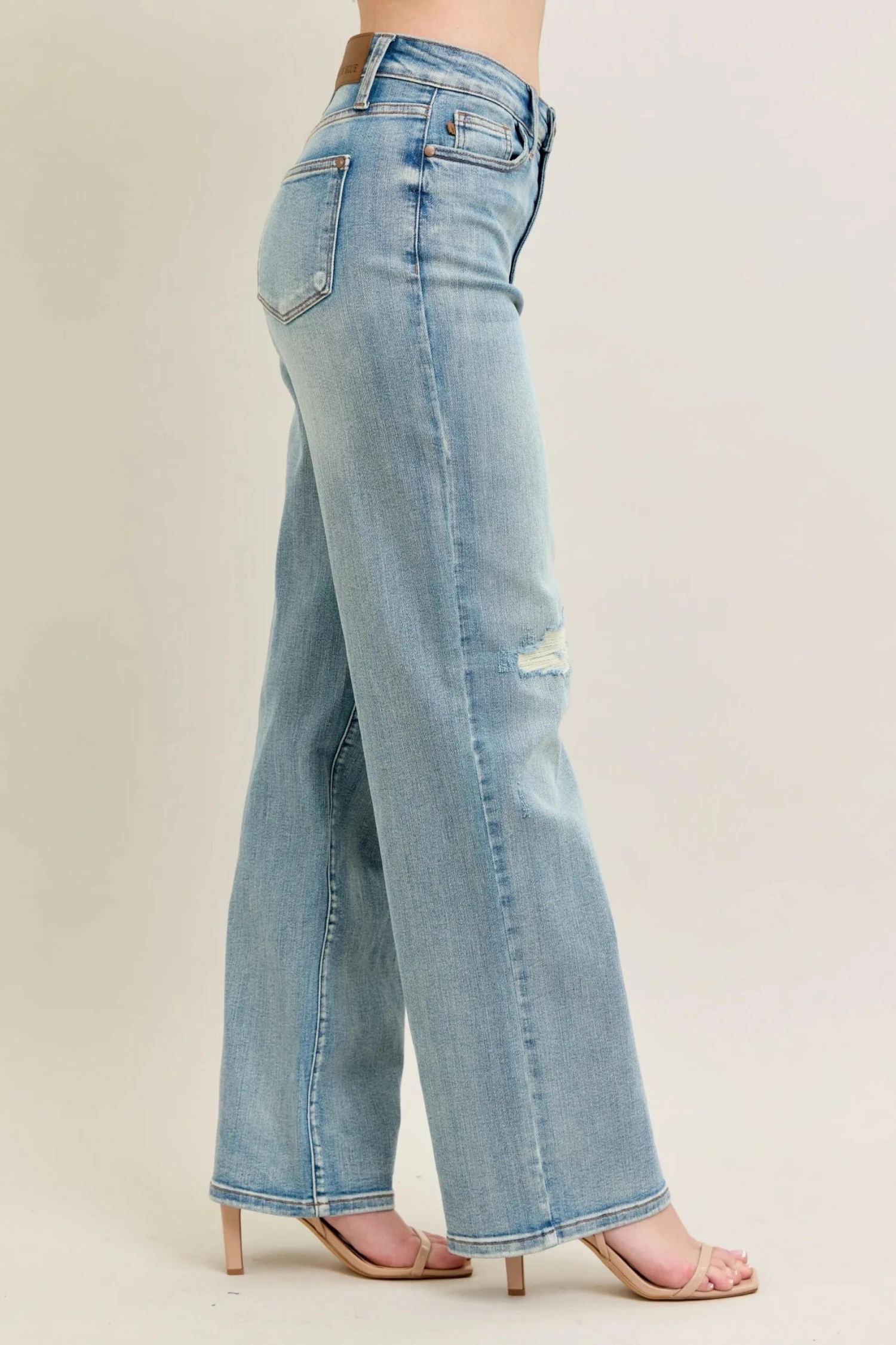 These premium wide-leg jeans feature a fashionable high-rise fit and authentic light wash treatment. Made from quality denim fabric, they offer both style and comfort. The strategic distressing adds vintage character while maintaining modern appeal. The relaxed wide-leg cut provides easy movement and pairs perfectly with any casual top. Perfect for achieving that coveted lived-in denim look with contemporary styling.