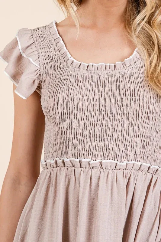 Make a stylish statement with this solid ruffle trim smocked dress featuring a contrast design. The ruffle trim adds a feminine touch to the dress. The smocked detailing offers a flattering and comfortable fit. The contrast design adds a unique and eye-catching element to the dress. Perfect for a special occasion or a chic daytime look. Embrace a fashionable and trendy style with this versatile and flattering dress.