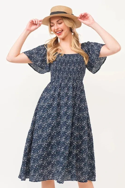 Step into spring with style in this smocked floral print flutter sleeve midi dress. The smocked bodice offers a flattering and comfortable fit. The floral print adds a touch of femininity and charm to the dress. The flutter sleeves create a romantic and whimsical look. Perfect for a garden party or brunch outing. Embrace a fresh and fashion-forward style with this gorgeous midi dress.