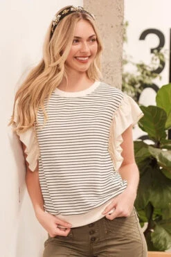 Elevate your look with this Striped Contrast Ruffle Detail Sleeveless Top. The striped contrast detailing adds a modern and eye-catching element to the top. The ruffle detail offers a feminine and stylish touch. Perfect for dressing up a casual outfit or adding flair to your workwear. Pair with pants or a skirt for a chic and versatile ensemble. Embrace a trendy and sophisticated style with this flattering and unique top.