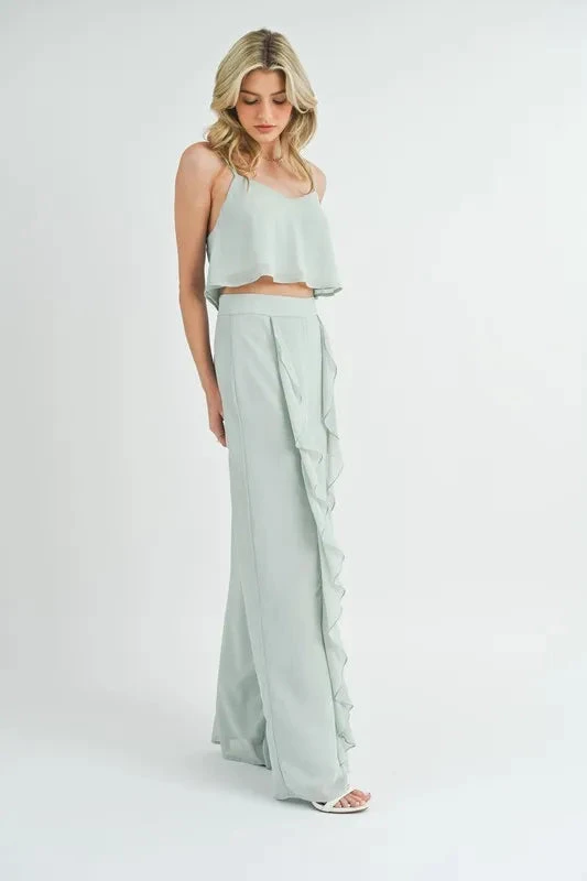 A crop cami and ruffled wide leg pants set is a chic and stylish ensemble that combines modern trends with feminine details. The crop cami adds a touch of casual sophistication, while the ruffled wide leg pants bring a fun and playful element to the outfit. This set is perfect for a variety of occasions, from casual outings to dressier events. Pair it with heels or wedges to dress it up, or opt for sneakers or sandals for a more relaxed look. Embrace the trendy and versatile appeal of this fashionable set!
