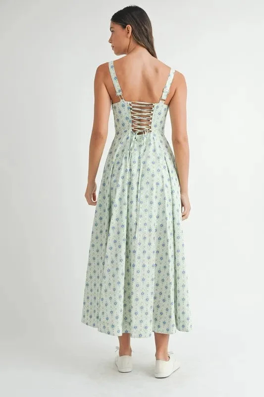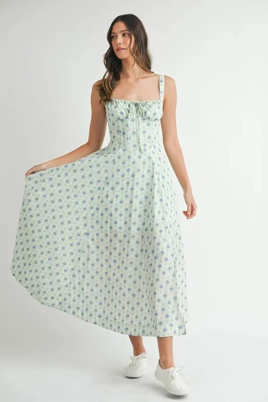 A floral print bustier back lace-up midi dress is an elegant and romantic dress featuring a floral pattern, a flattering bustier bodice, and a lace-up detail at the back. This midi dress exudes femininity and sophistication, perfect for special occasions or date nights. The lace-up back adds a touch of allure and allows for an adjustable fit, while the floral print adds a whimsical and charming vibe. Pair this dress with heels and delicate accessories for a stunning and fashionable look.