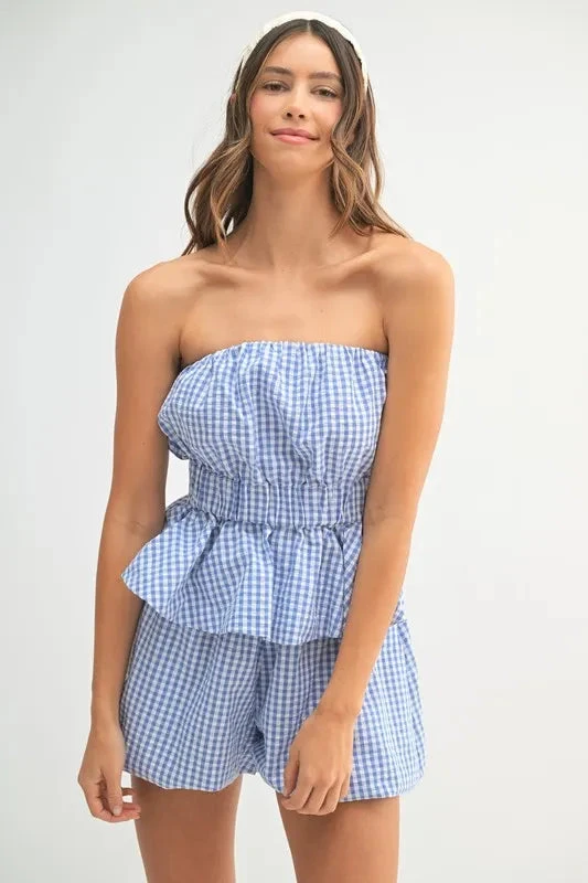 This Gingham Tube Top and Shorts Set is a trendy and cute ensemble that is perfect for warm weather. The classic gingham pattern adds a touch of retro charm to the outfit. Made from lightweight and breathable fabric, this set is comfortable and stylish for a day out in the sun.