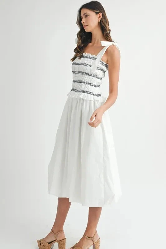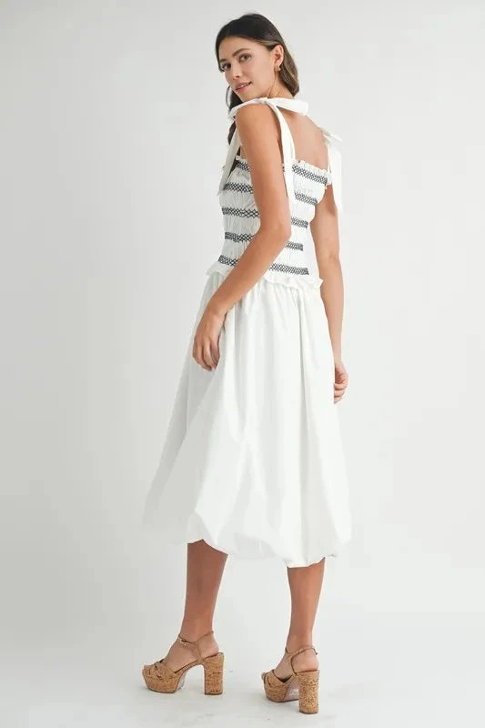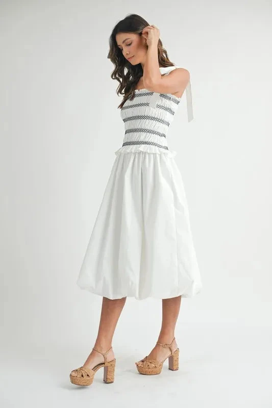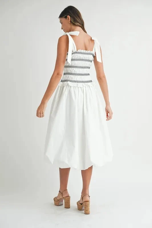 A smocked bodice bubble midi dress is a cute and stylish option for a casual yet chic look. The smocked bodice provides a comfortable and flattering fit, while the bubble midi skirt adds a playful and trendy touch. This dress is perfect for various occasions, from brunch dates to summer outings. Pair it with sandals or sneakers for a relaxed vibe, or dress it up with heels and accessories for a more polished ensemble. Enjoy the comfort and fashion-forward style of this trendy midi dress!