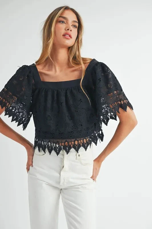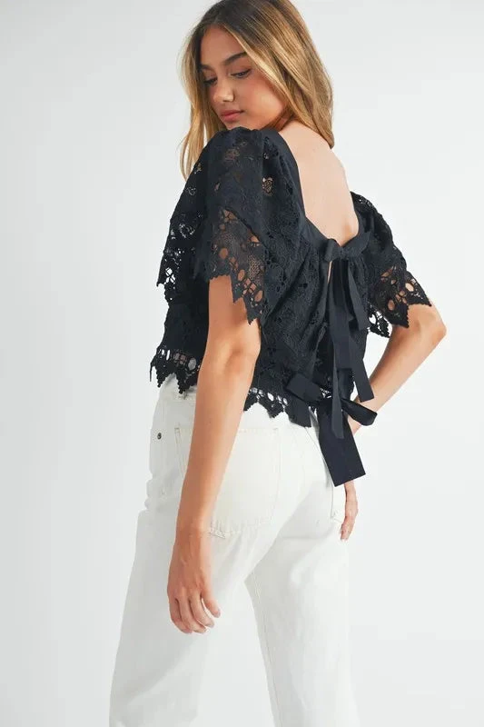 The square neck crochet lace top with double bow tie is a romantic and elegant choice for a feminine outfit. The crochet lace detailing adds a delicate and intricate touch to the top, while the square neck design brings a sophisticated and vintage flair. Perfect for a special occasion or a date night, this top exudes a charming and graceful vibe. Pair it with high-waisted trousers or a skirt for a chic and refined ensemble that will showcase your unique style and grace.